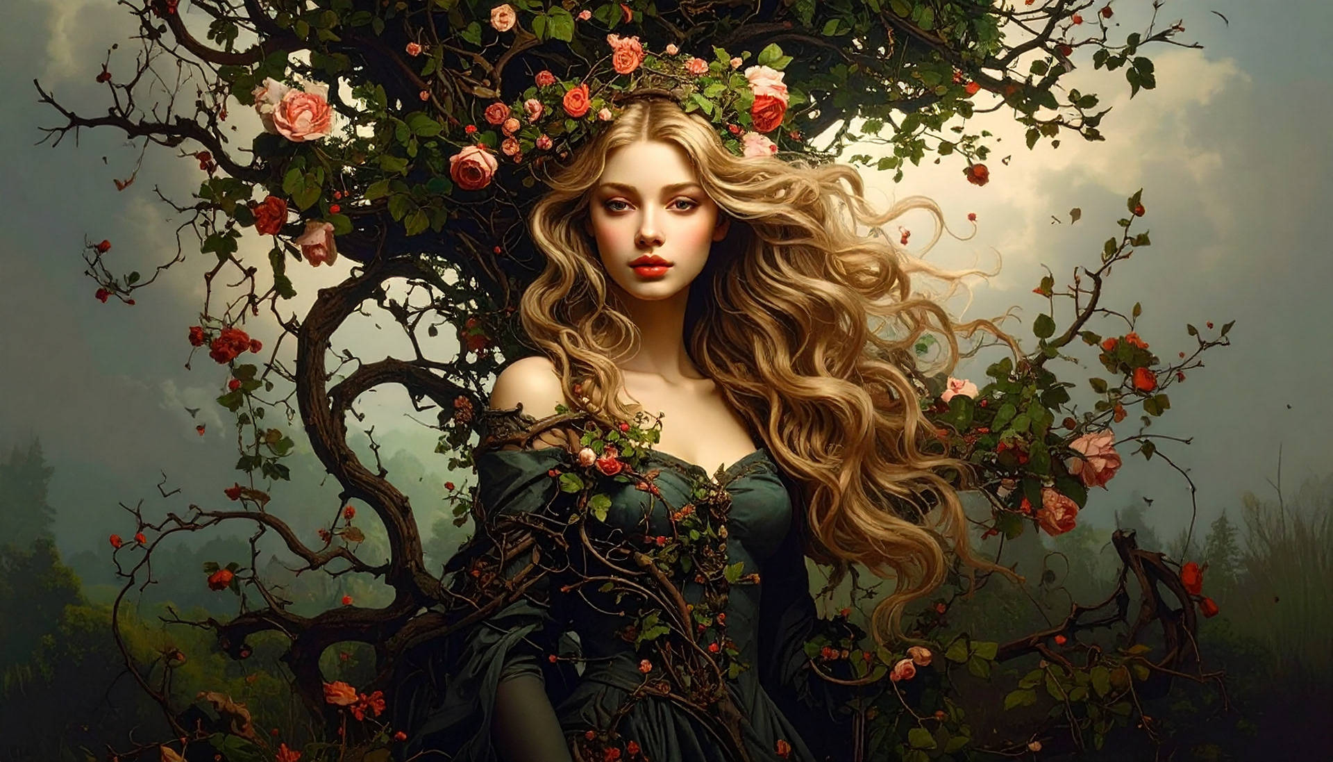 Ideation: Briar Rose, a beautiful young woman entangled in a blooming rose vine. Adobe Firefly
