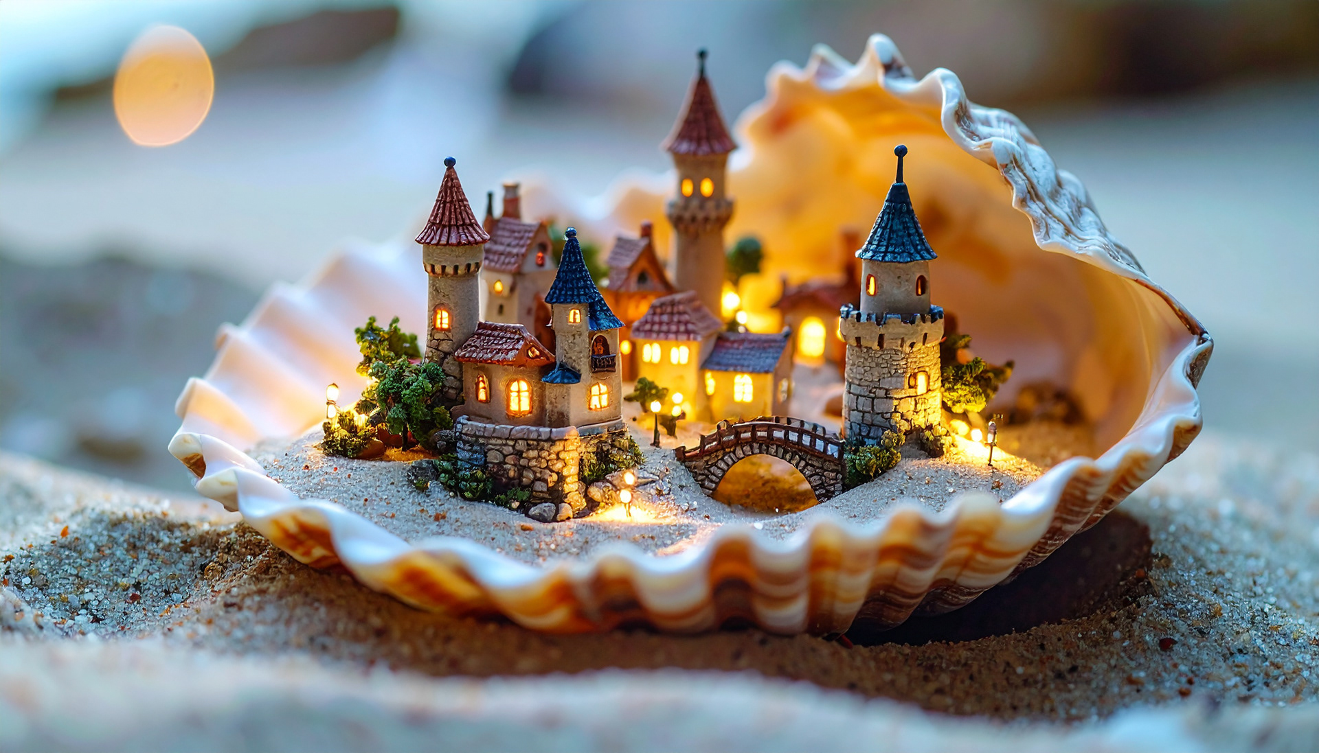 Ideation: A tiny medieval village exists in a seashell on the sand. Adobe Firefly
