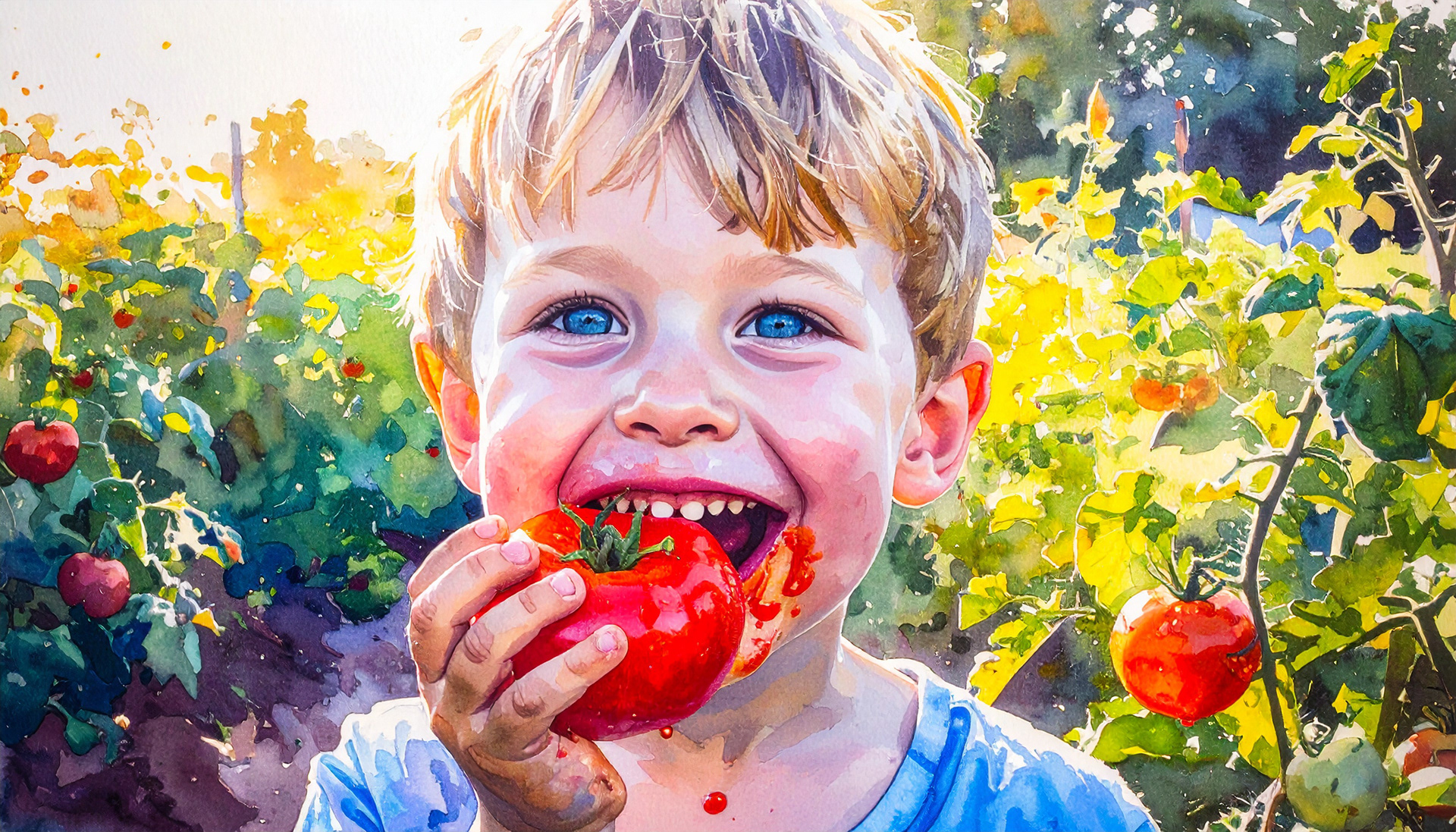 Ideation: An illustration of a young boy eating a fresh tomato right off the vine in a garden in summer. Adobe Firefly