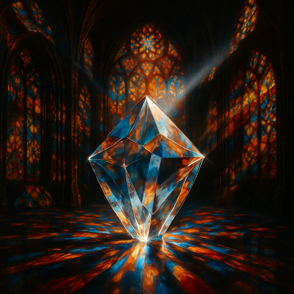 Ideation: Experiment with the idea of a large, prismatic crystal in a stained glass cathedral with light both reflecting and refracting. DALL-E 5