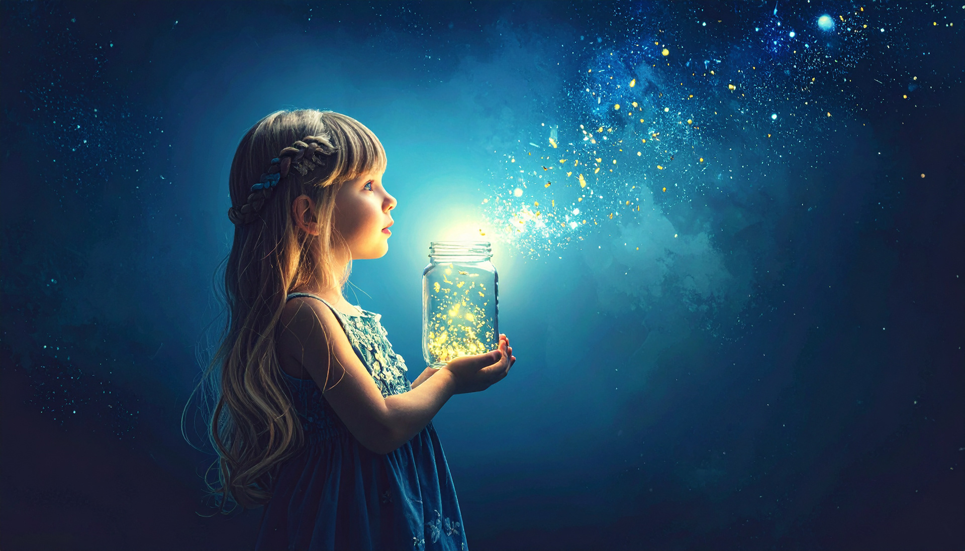 Ideation: A little girl holds a mason jar and is releasing fireflies back into the night sky. Adobe Firefly