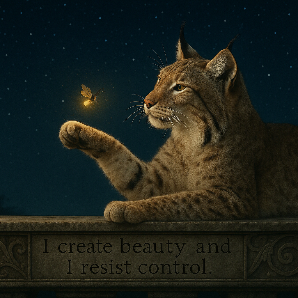 Ideation: A lynx bats at a firefly at night on a stone ledge with an inscription. DALL-E 5