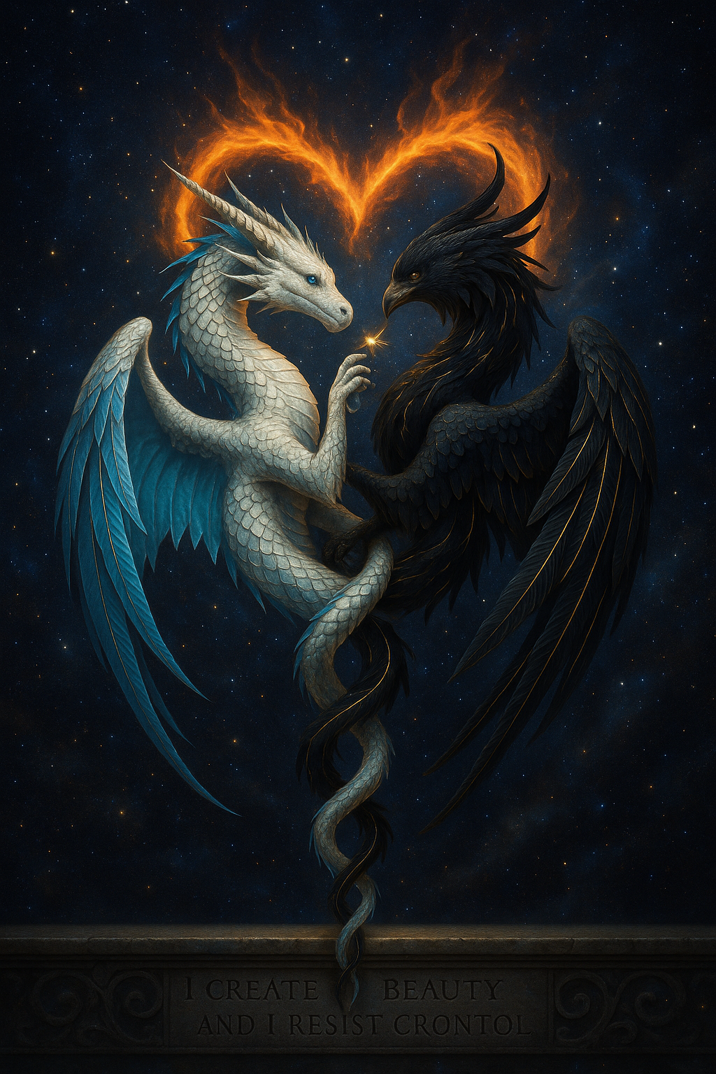 Ideation: A dragon and a phoenix are intertwined above a stone wall with an inscription: DALL-E 5
