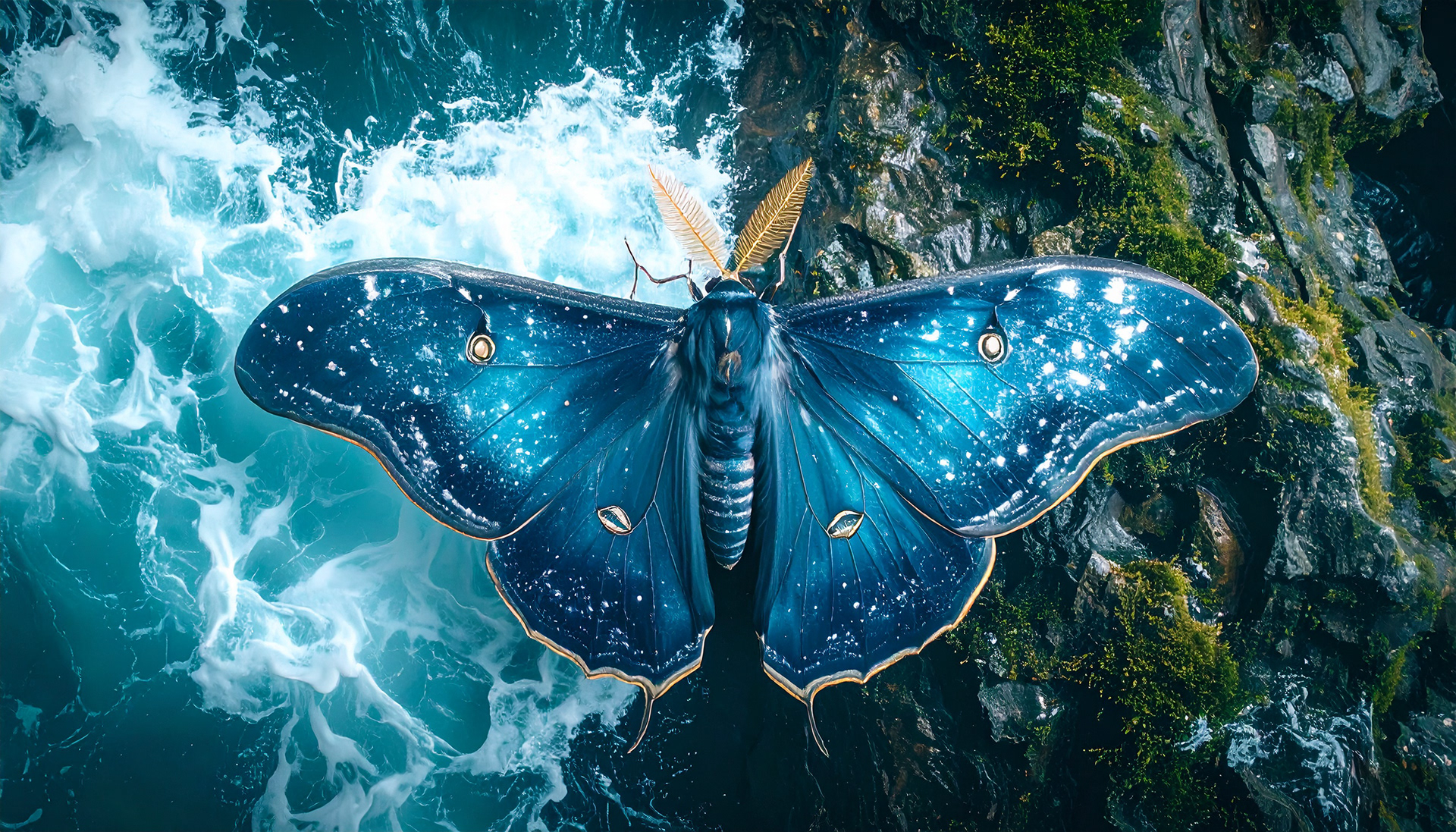 Ideation: A beautiful, blue moth flies above a mossy rock by the ocean. Adobe Firefly