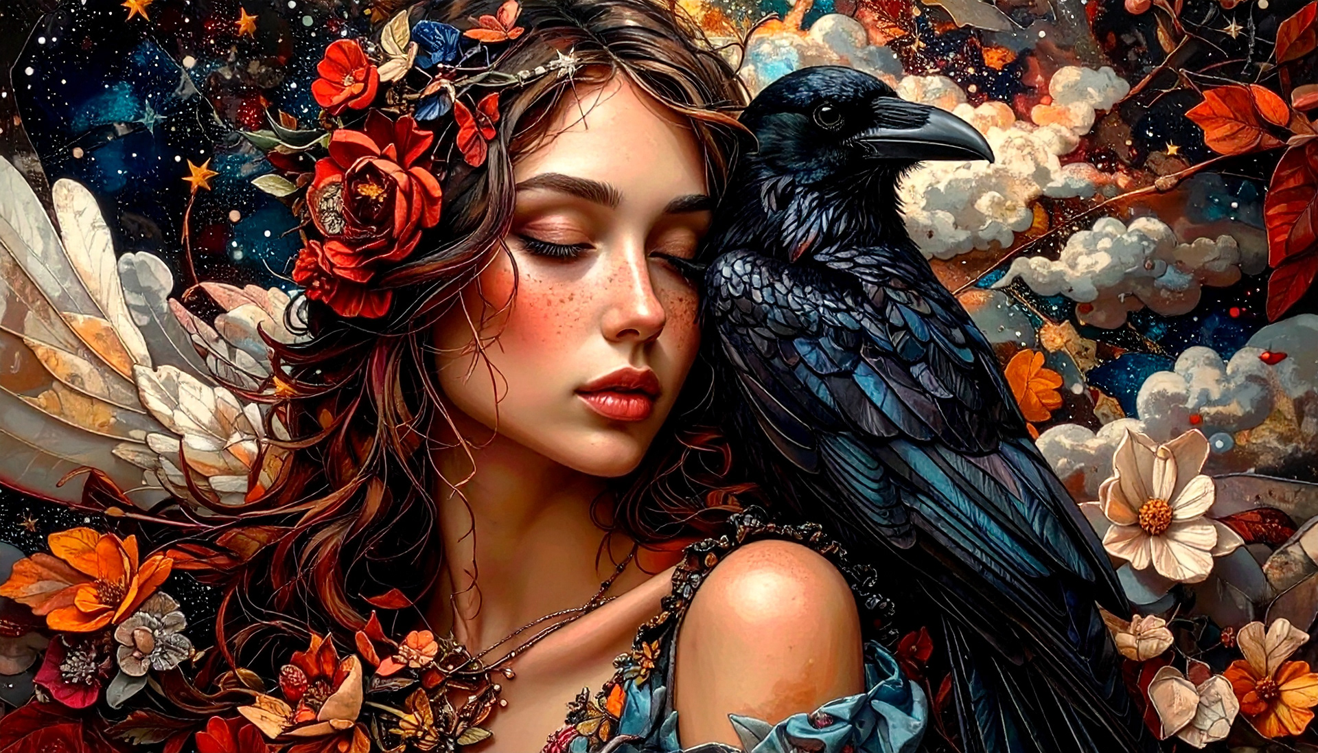 Ideation: Beautiful young woman and a raven with flowers in a fantasy style. Adobe Firefly