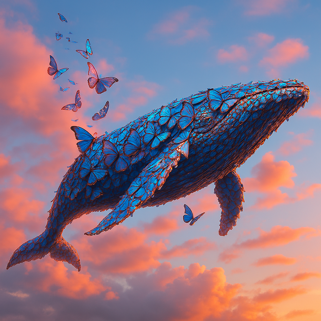 Illustration concept: Make something large from many small things. A blue whale made from many Blue Morpho butterflies. DALL-E 4
