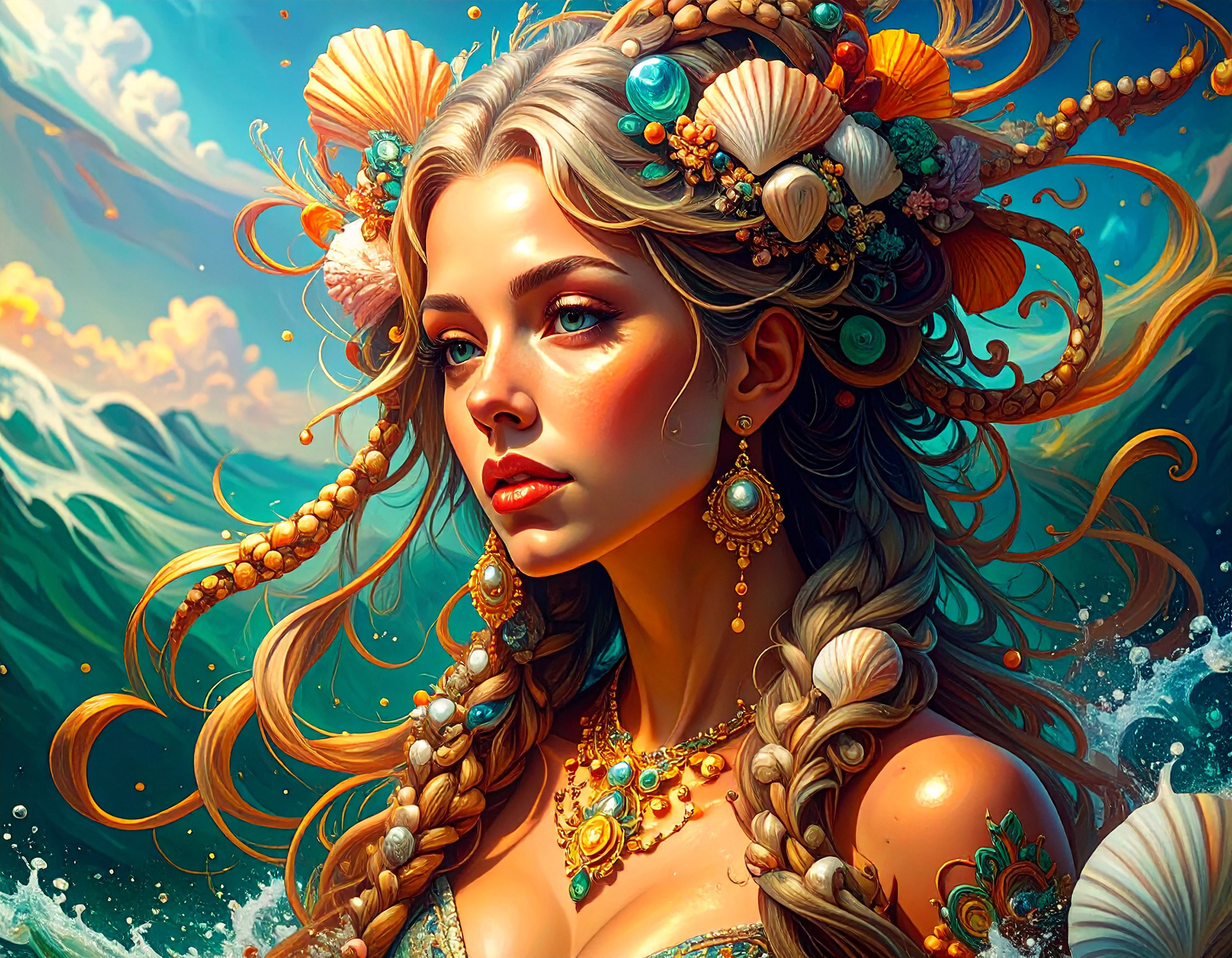 Ideation: A beautiful young woman rises from the ocean. Her hair is braided with shells and sea glass. Adobe Firefly