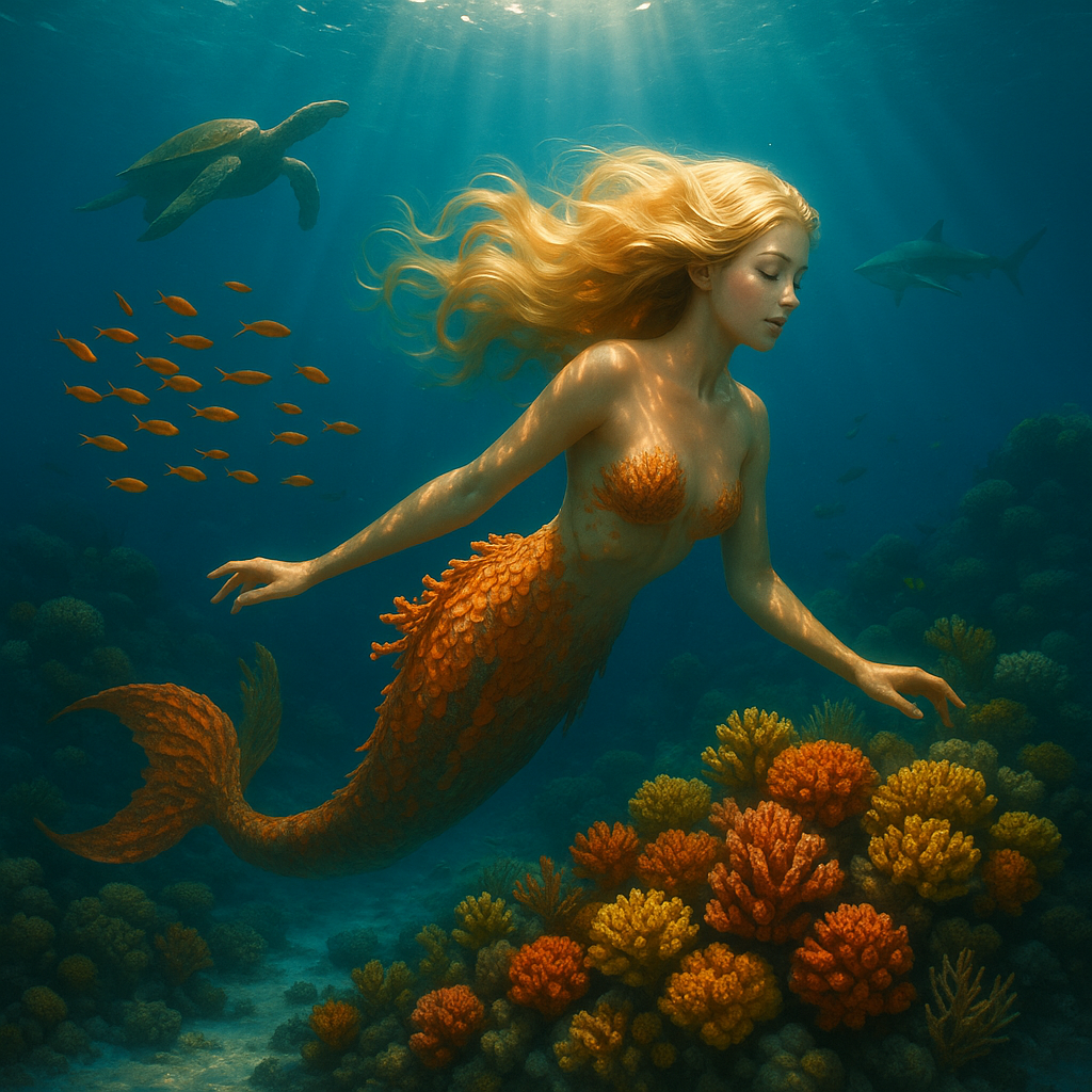 Ideation: A mermaid swims past coral beds underneath the ocean. DALL-E 5